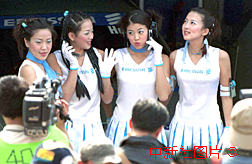 第四十六屆澳門(mén)格蘭披士賽車場(chǎng)上的賽車宣傳女郎擺"甫士"供人們拍照,成為賽場(chǎng)上的另一風(fēng)景。