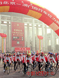慶祝澳門回歸慶典活動(dòng)之一的"中旅杯九九迎回歸北京至澳門自行車?yán)?二十一日開始,十二支專業(yè)隊(duì)的七十多名運(yùn)動(dòng)員上午九點(diǎn)三十分由天安門廣場出發(fā)。這是中國規(guī)模最大、水平最高、距離最長的自行車比賽。