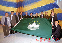 在24日舉行的中國(guó)載人航天工程試驗(yàn)飛船返回艙開(kāi)艙儀式上,人們展示在這艘試驗(yàn)飛船上搭載的澳門特別行政區(qū)區(qū)旗。這面區(qū)旗將作為中國(guó)航天人對(duì)澳門回歸的賀禮贈(zèng)送給澳門特別行政區(qū)。