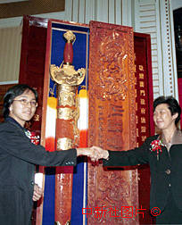 為慶祝澳門(mén)回歸祖國(guó),河南省旅游局與登封市人民政府將一柄制作精良、重五十斤的特大型少林寶劍贈(zèng)送給澳門(mén)人民。圖為河南省旅游局副局長(zhǎng)方洪蓮(右)向澳門(mén)政府旅游司代司長(zhǎng)文綺華贈(zèng)送寶劍。