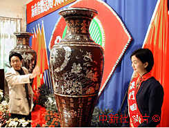 海南省祝賀澳門回歸的禮品—— “椰樹傳說”和“天涯歡歌”巨型椰雕嵌貝花瓶二月一日下午在?谑姓搅料,不日將運往珠海然后送抵澳門。兩座花瓶各重八十公斤,高一千九百九十九毫米。這對花瓶由海南省藝術家設計,?谑幸駨S的三十名工匠共同制作完成的。