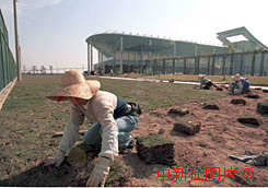 澳門回歸前夕,女工在政權交接儀式會場外鋪設草坪. 中新社傳真 王瑤
