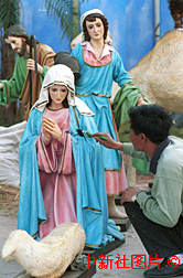 澳門市工人在街頭裝飾圣經故事人物塑像,迎接圣誕節(jié)的到來。 中新社傳真 毛建軍攝