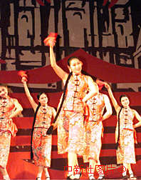 喜迎澳門回歸歌舞音樂會十四日在北京人民大會堂舉行。圖為陳愛蓮藝術(shù)團(tuán)的演員在表演舞蹈《大姑娘美》。
