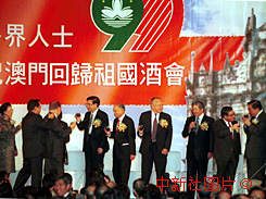 香港各界十八個團體十五日在會議展覽中心舉行盛大酒會,特首董建華、外交部駐港特派員公署特派員馬毓真、新華社香港分社社長姜恩柱等嘉賓舉杯相互祝賀回歸澳門祖國。 中新社傳真洪少葵攝