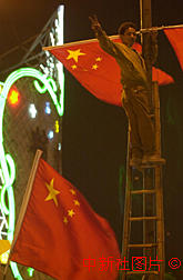 澳門市政工人深夜在葡京酒店賭場外高掛五星紅旗。