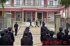 16日上午,在蒙蒙細(xì)雨中的澳督府門前舉行降旗演練儀式。