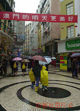 澳門(mén)板樟堂街鬧市懸掛醒目標(biāo)語(yǔ),表達(dá)出市民對(duì)回歸后的信心。中新社數(shù)碼傳真 賈國(guó)榮攝