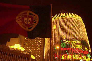 澳門著名的葡京酒店裝飾佳節(jié)彩燈,歡慶回歸盛事和圣誕千禧好事相連。