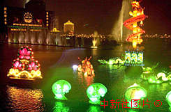 中國著名的自貢"龍燈之鄉(xiāng)"特意為澳門南灣湖裝飾慶回歸大型燈展,十六日夜開始大放光彩。