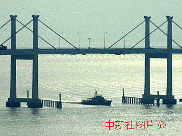 中國軍艦航行在澳門回歸交接儀式場地附近的友誼大橋下,保證海域和交通的平安。