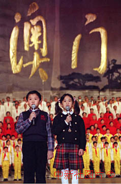 澳門(mén)小歌手陸勁東、陳芷華在北京加緊排練,準(zhǔn)備二十日晚在北京首都體育館舉行的慶祝澳門(mén)回歸晚會(huì)上演出。