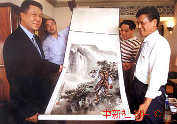 北京著名畫家李廣利(右一)近期在北京向澳門特區(qū)行政長官何厚鏵(左一)贈送了一幅國畫《大展雄風(fēng)》,以表示他對澳門的美好祝愿。