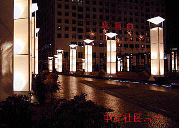 澳門政權(quán)交接場地外的迎賓路兩邊豎立透明燈柱,富于現(xiàn)代藝術(shù)氣息。 中新社數(shù)碼傳真 賈國榮攝