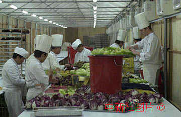 廚師十八傍晚在舉行澳葡政府告別酒會(huì)的宴會(huì)廳廚房內(nèi)為最后的晚餐精心準(zhǔn)備菜肴。 中新社傳真 毛建軍攝