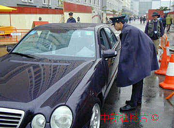 澳門(mén)警察十八日冒雨在政權(quán)交接場(chǎng)地周?chē)鷻z查車(chē)輛,疏導(dǎo)交通。中新社數(shù)碼傳真