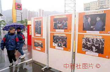 香港島各界聯(lián)合會十八日冒雨在維多利亞公園舉辦"慶祝澳門回歸祖國圖片展覽",展覽展示了中華民族從此洗脫屈辱的歷程和回歸前的澳門風貌。中新社傳真楊佐桓攝