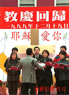澳門(mén)宗教界人士十九日在大三巴遺址廣場(chǎng)齊唱頌歌,歡慶回歸。中新社傳真 賈國(guó)榮攝