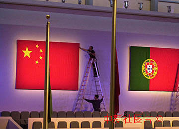 交接儀式即將來臨,工作人員一絲不茍的在整理國旗。中新社數(shù)碼傳真 毛建軍攝