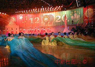 19日晚,珠海市舉辦多臺文藝晚會迎接澳門回歸。圖為珠海體育中心上演的《我們九九在一起》。作者:蕭琨