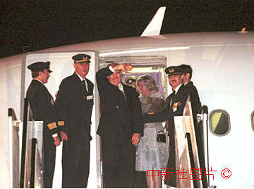 澳門總督韋奇立二十日子夜在政權(quán)交接儀式禮成后,與夫人登上飛機(jī),最后揮手告別。中新社傳真 賈國(guó)榮攝