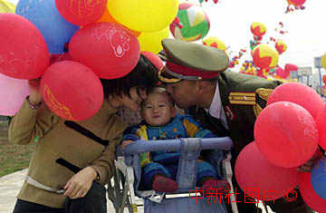 駐澳部隊(duì)通訊兵黃立新和前來送行的妻子,一歲的兒子告別。中新社數(shù)碼傳真 王瑤攝