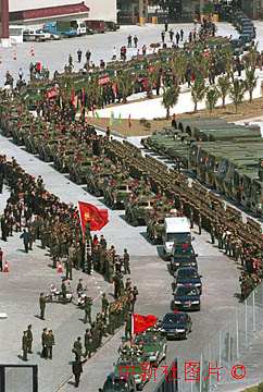 中國人民解放軍駐澳門部隊二十日中午十二時編隊整齊威嚴(yán),經(jīng)關(guān)閘進入澳門。 中新社傳真 毛建軍攝