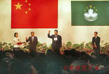 澳門特區(qū)政府在成立首日舉行招待會(huì),首任行政長(zhǎng)官何厚鏵向國(guó)務(wù)院副總理錢其琛舉懷共賀。 中新社傳真 宗金柱攝