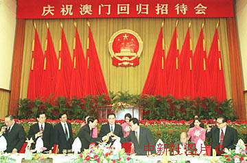 為慶祝澳門順利回歸,二十日下午首都各界人士在北京人民大會(huì)堂歡聚一堂,參加國(guó)務(wù)院舉行的慶祝澳門回歸招待會(huì)。作者:任海霞