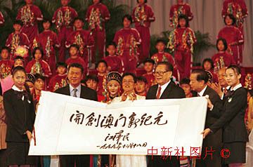 江澤民主席二十日上午出席澳門特區(qū)成立慶祝大會時,向澳門特區(qū)政府贈送書有“開創(chuàng)澳門新紀元”的橫幅。 中新社傳真 李剛攝