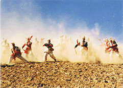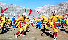 安塞位于陜北高原,那里的腰鼓歷史悠久,格調(diào)古樸。人們?cè)跉g度節(jié)日,慶祝豐收的時(shí)候,都要演出腰鼓助興,每次演出的陣容都很大,一般都有60名左右的鼓手。有時(shí)幾個(gè)隊(duì)連在一起,能拉開一兩里路距離。腰鼓手們的裝束一律著古代將士的便服,或黃或紅包頭,素色衣服,顯得整齊壯觀。電影《黃土地》里的腰鼓手們穿著黑色,想必是為了渲染貧苦背景。實(shí)際上,過去上場(chǎng)表演的腰鼓手們,很少有穿皂服的。