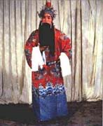 長(zhǎng)袍類(lèi) 一、蟒:也稱(chēng)龍袍、蟒袍,是帝、王、將、相在朝賀宴會(huì)或辦公事的時(shí)候所穿的禮服。 蟒的樣式是圓領(lǐng)、大襟、長(zhǎng)度一般拖到腳面,袖子寬闊、肥大,帶水袖,配有寬松的腰帶。 這是戲曲舞臺(tái)上扮演帝王、官員等角色使用量最多的一種蟒袍,扮演文臣武將的老生、小生、武生都可使用。在戲曲舞臺(tái)上,常由蟒袍的色彩來(lái)區(qū)別劇中任的身份、地位與年齡。蟒袍大體分為紅、明黃、杏黃、白、藍(lán)、綠、紫、粉紅、淡湖、淺米、古銅、豆沙、香色等。原箱蟒袍分為上、下五色,上五色是紅、綠、黃、白、黑色;下五色是藍(lán)、紫、粉紅、淡青和香色。明黃與杏黃是扮演皇帝、番王、王子以及齊天大圣(孫悟空)的蟒袍專(zhuān)用色,其他角色不得使用。 蟒的圖案主要是龍形圖案。十團(tuán)龍蟒袍在繡工上大體分為彩繡、墨繡、平金漏地繡、滿(mǎn)金繡、半金半彩繡、裹金繡(一金線(xiàn)、一彩線(xiàn)混合繡)等。繡法各異,色彩紛呈。不同的繡工處理與十團(tuán)龍圖案相配合,使得十團(tuán)龍蟒袍造型莊重、文雅、氣派。 穿用十團(tuán)龍蟒袍的有《甘露寺》中的劉備(因是漢中山靖王劉勝之后,漢景帝之玄孫,過(guò)江招親時(shí),穿紅色十團(tuán)龍袍)、《秦香蓮》中的陳世美(因考中狀元,被招為東床駙馬后,穿十團(tuán)龍紅色蟒袍)、《玉堂春》中的王金龍(因中頭名狀元,并被封為八府巡按,當(dāng)他會(huì)同藩司、臬司三堂會(huì)審舊時(shí)情人蘇三(玉堂春)時(shí),穿十團(tuán)龍紅色蟒袍)。 而平金繡散龍黑色蟒袍則是戲曲舞臺(tái)上扮演花臉行當(dāng)?shù)奈某、武將的官服或朝服。舞臺(tái)上常見(jiàn)的散龍蟒袍有黑、藍(lán)、紫、綠、杏黃等色。 散龍圖案式樣繁多,其造型比團(tuán)龍活潑、豪放。如散坐龍、散升龍、散降龍、倒掛龍、噴水龍、串水龍、串云龍、回頭龍、教子升天龍(一大龍、一小龍)、戲珠升降龍等等,均是散龍大蟒袍常用的圖案。 制作時(shí)以平金繡為主,稍加彩繡為裝飾色,配合騰云飛舞的散龍圖案,及大面積金海水為下擺(海水江芽),其造型格外莊重輝煌。 穿用人物有《秦香蓮》中的包文正(包公)、《霸王別姬》中的項(xiàng)羽(在出征前,除名演員穿黃色蟒袍外,一般都穿黑色散龍大蟒袍)等。 在戲曲舞臺(tái)上扮演地位較高而又到蒼老年齡的文職官員,其穿用的朝服有裹金繡香色蟒袍。因?yàn)閷?zhuān)為老年官員穿用,所以力求色彩沉穩(wěn),但又不失輝煌效果。制法上采用一線(xiàn)一金的"裹金繡",繡制團(tuán)龍圖案。穿用人物有《甘露寺》中的喬玄、《秦香蓮》中的王延齡等。 而彩繡豆沙色蟒袍則適合舞臺(tái)上扮演地位較高,而又不到蒼老年齡的文職官員穿用。制作時(shí)要求色彩文雅,采用團(tuán)龍圖案,用雅彩裹金繡繡制海水江芽。穿用人物如《將相和》中的藺相如。 彩繡紅色女蟒袍一般為戲曲舞臺(tái)上扮演皇后、貴妃、公主、誥命夫人(受皇帝冊(cè)封的貴婦)及掛帥女將等的朝服和公服。有時(shí)也當(dāng)作世宦人家結(jié)婚時(shí)的禮服。以紅色為主,分為彩繡與平金繡兩種;y多用團(tuán)鳳、散鳳和牡丹等,也可龍鳳并用。蟒袍下擺繡有"海水江芽"。女蟒袍有老式和新式兩種式樣。老式女蟒袍,外緣加寬邊;新式女蟒袍形同男蟒袍,不加外邊緣。色彩要求艷麗、輝煌,體現(xiàn)出人物的雍容華貴。 穿用人物有《貴妃醉酒》中的楊玉環(huán)(身著紅色女蟒袍到百花亭侯駕)、《大登殿》中的王寶釧(身穿紅色女蟒袍上朝見(jiàn)君受封為昭陽(yáng)正宮娘娘)。 老旦蟒袍多為戲曲舞臺(tái)上扮演皇太后和地位較高的誥命老夫人穿用的朝服或公服, 穿用人物有《太君辭朝》中的佘太君、《甘露寺》中孫權(quán)之母吳氏。 在戲曲舞臺(tái)上扮演番邦后妃、公主等的朝服,一般稱(chēng)為女旗蟒袍。以紅色地為主,分彩繡與平金繡兩種,用團(tuán)龍、團(tuán)鳳和龍鳳等圖案。清朝服裝的女旗蟒袍不用"護(hù)領(lǐng)",用湖色硬翻領(lǐng)(類(lèi)似現(xiàn)代襯衣硬領(lǐng))(領(lǐng)衣),蟒袍下擺海水無(wú)開(kāi)起,旗蟒身長(zhǎng)以不露鞋為標(biāo)準(zhǔn)。 穿用人物有《四郎探母》中的鐵鏡公主(朝見(jiàn)蕭太后穿朝服女旗蟒袍)、《大登殿》中的代戰(zhàn)公主(上殿朝駕時(shí)穿朝服旗蟒)。 蟒中還派生出兩種袍服:一種是官衣,一種是宮衣。 1.官衣:是一般文職官員穿用的禮服。式樣同蟒。圖案是在胸前和背后繡一塊方形的圖案,官衣的色彩有紅、藍(lán)、紫、黑、古銅等。 官衣多為戲曲舞臺(tái)上扮演新科狀元、榜眼、探花等角色臨時(shí)的官服。待任命官職之后再按品級(jí)穿官服。官衣,還可作為七品縣官和新婚典禮中新郎官的吉服。 官衣顏色多為紅色、藍(lán)色、紫色、黑色和白色。黑色官衣品級(jí)最低,多為驛丞(驛站站長(zhǎng))、門(mén)官等穿用,不綴補(bǔ)子。白色為國(guó)喪孝服(不常用)。它的造型基本上是明代官服的原樣,只是加以藝術(shù)的美化和提高。 明代官衣不用素地,多用暗紋云錦織成衣料,而舞臺(tái)上大部分用素地(因云錦造價(jià)太高)。 明代官服補(bǔ)子(官員品級(jí)標(biāo)志)多在衣服的前胸、后背部直接繡成,而清代官服品級(jí)標(biāo)志是先繡成補(bǔ)子,然后再綴到天青色褂子上。 穿用人物